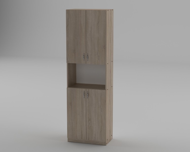 Шкаф имеет пять полок. Две сверху и две снизу полки закрываются дверями, посередине полка не закрытая.