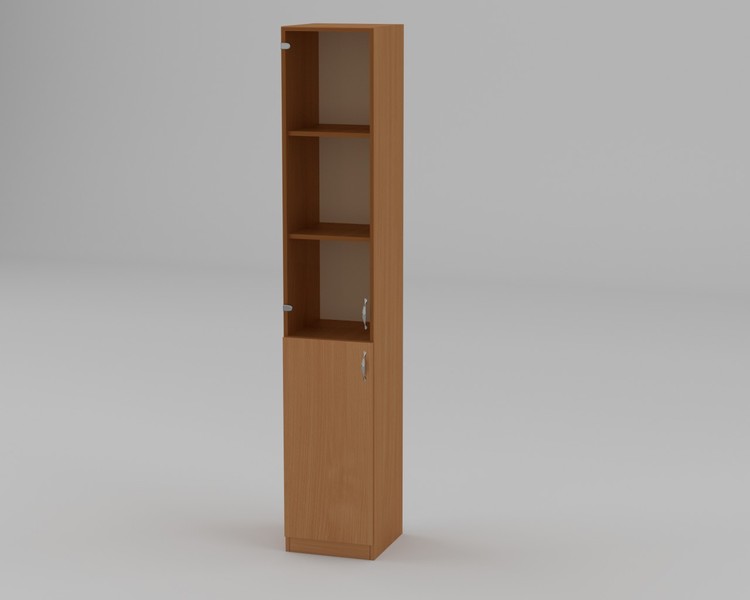 Шкаф с одной дверью на две нижние полки. Шкаф имеет пять полок. Шкаф офисный КШ-9 может изготавливаться в шести цветах ДСП: бук, венге, махонь, ольха, орех экко, яблоня.